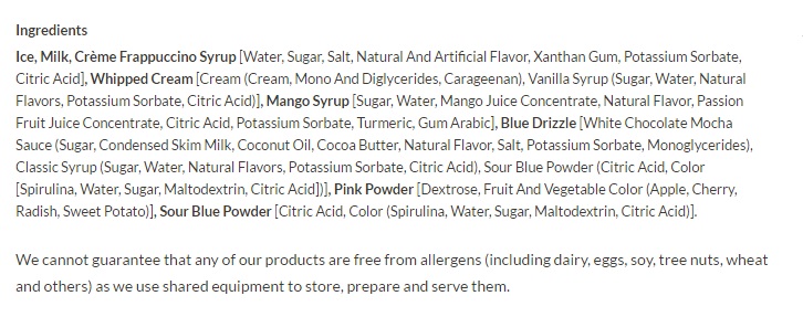 But seriously though – No matter what kind of milk used, the Starbucks Unicorn Frappuccino contains a diabetic explosion of 59 grams of sugar if you order a Grande (medium). That is 12 teaspoons of sugar. We’re not kidding!