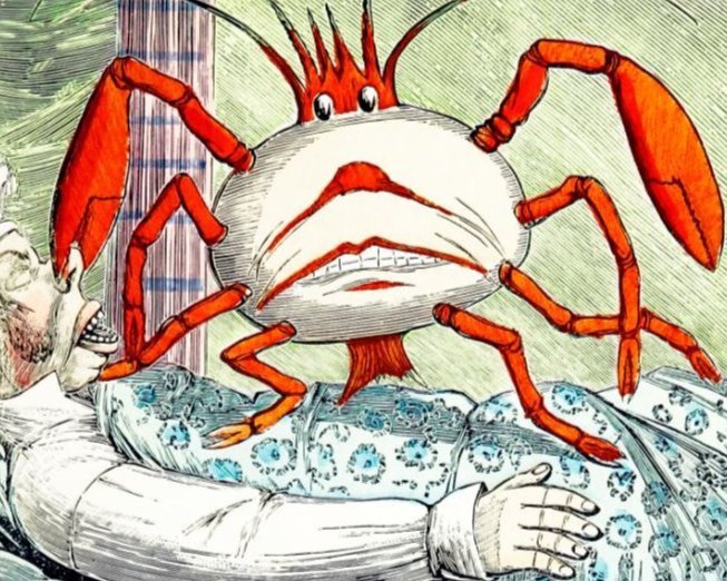 The crabs I’ve mentioned aren’t the only ones to appear in popular culture. Among the best known is Jimmy, a blue crab in James Michener’s epic novel Chesapeake (1976). In Michener’s florid hands, Jimmy moults and mates in painstaking detail until the 1886 flood that swelled the Susquehanna River dumps a ‘vast cesspool’ of human and industrial waste into the Chesapeake Bay: Jimmy, his mate, and some of the people who eat their kin don’t survive the toxins. (Could it be a coincidence that novelist John Barth, while claiming not yet to have read Michener’s book, quipped that ‘most historical fiction is a pretty fishy rendition of a crab’, not long after its publication?) You might find a crab or two in Lewis Carroll’s Alice’s Adventures in Wonderland (1865) or even in one of the video games based on it, such as the horror-adventure Alice: Madness Returns (2011), where you can encounter the cigar-chomping Cannon Crab. There are annoying little crabs in the Disney/Pixar film Finding Nemo (2003) that hang out on sewer pipes, pester passers-by and don’t really want to help find Nemo. And there are sometimes crabs, in droves, in Disney’s Peter Pan spin-off, the cartoon tv series Jake and the Never Land Pirates (2011–16). King Crab is the bearded, boastful leader of King Crab Island, not far from Never Land. ‘I used to be the prince of pinch. Now . . . I’m the royal claw!’, he sings, living up to expected stereotypes. It is perhaps only the same series’ occasional appearances by Snappy the Hermit Crab that go against the grain: Snappy, who inhabits a pink shell with purple polka dots, is friendly and gentle. (In our imaginations, maybe it is only brachyurans that are crabby.)